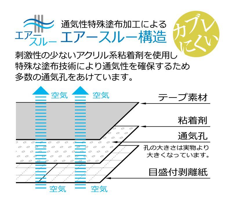 ◇特殊な塗布技術で通気性を確保し、お肌がムレにくい。多数の通気孔をあけています。
